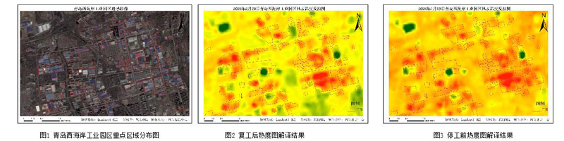 高分山东中心烟台分中心利用多源卫星遥感数据,对青岛西海岸工业园区复工情况进行了遥感解译分析。分别选取停工前的2020年1月19日卫星数据和复工期间的2020年2月20日卫星数据进行处理比对,图1为青岛工业园区分布图,图2和图3以热图形式显示了复工后和停工前的示意图,从卫星数据解译结果可以看出,青岛工业园区复工后与停工前差异较小,基本达到停工前规模。